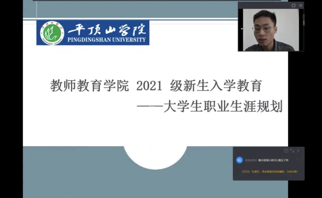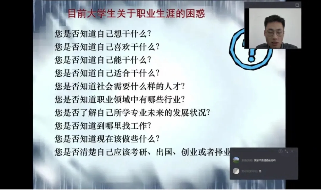 为了让21级新生对未来职业走向和职业发展有更清晰的认识,太阳成官网于9月29日面向全体21级新生组织开展“职业生涯规划”线上主题课堂。本次课堂由tyc234cc 太阳成集团辅导员李世尧老师主讲。李老师将本次课堂划分为三大块:什么是职业生涯规划、为什么要做职业生涯规划、怎样做生涯规划三大部分,带领同学们更好地认识和了解大学生职业生涯规划。