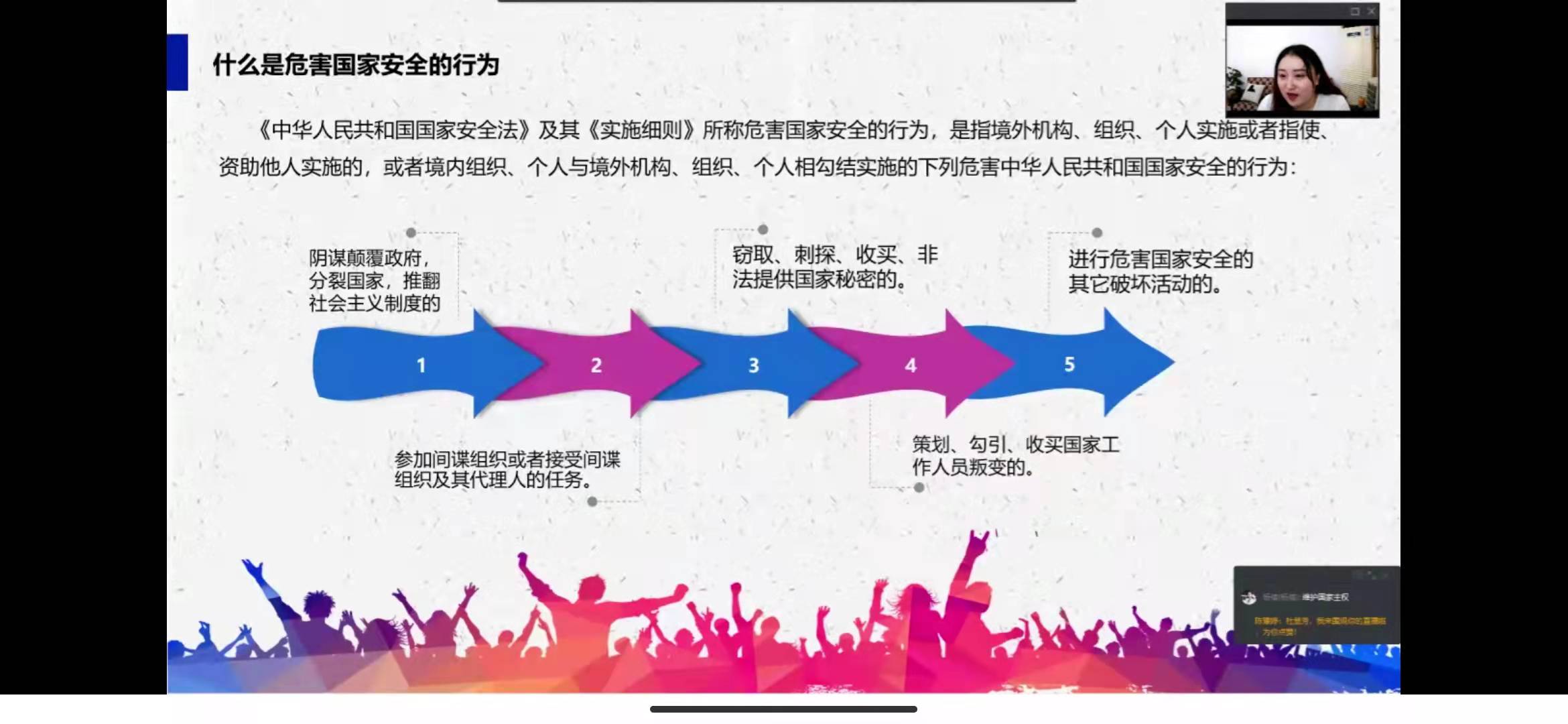 李琦老师就“国家安全教育”展开了形势政策第五讲。维护国家安全是全国各族人民根本利益所在。国家安全是安邦定国的重要基石,维护国家安全是全国各族人民根本利益所在,要完善国家安全战略和国家安全政策,坚决维护国家政治安全,统筹推进各项安全工作。