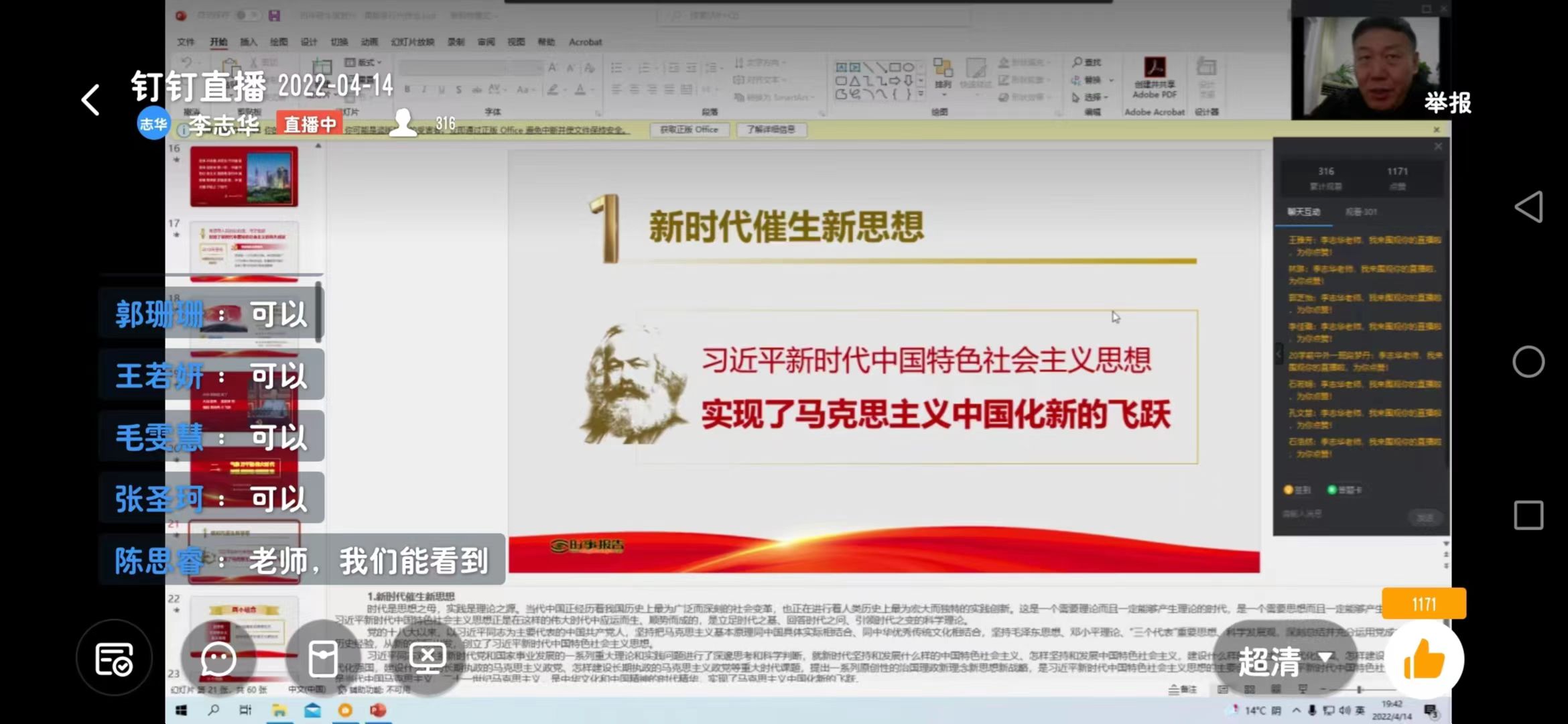 为使当代大学生在中国共产党百年华诞的重大历史时刻、继往开来的重大历史关头,更加认识到中国共产党的伟大成就,按照学校大思政方针,2022年4月14日晚19点,tyc234cc 太阳成集团党总支书记李志华通过钉钉直播进行本学期《形势与政策》课第一讲。