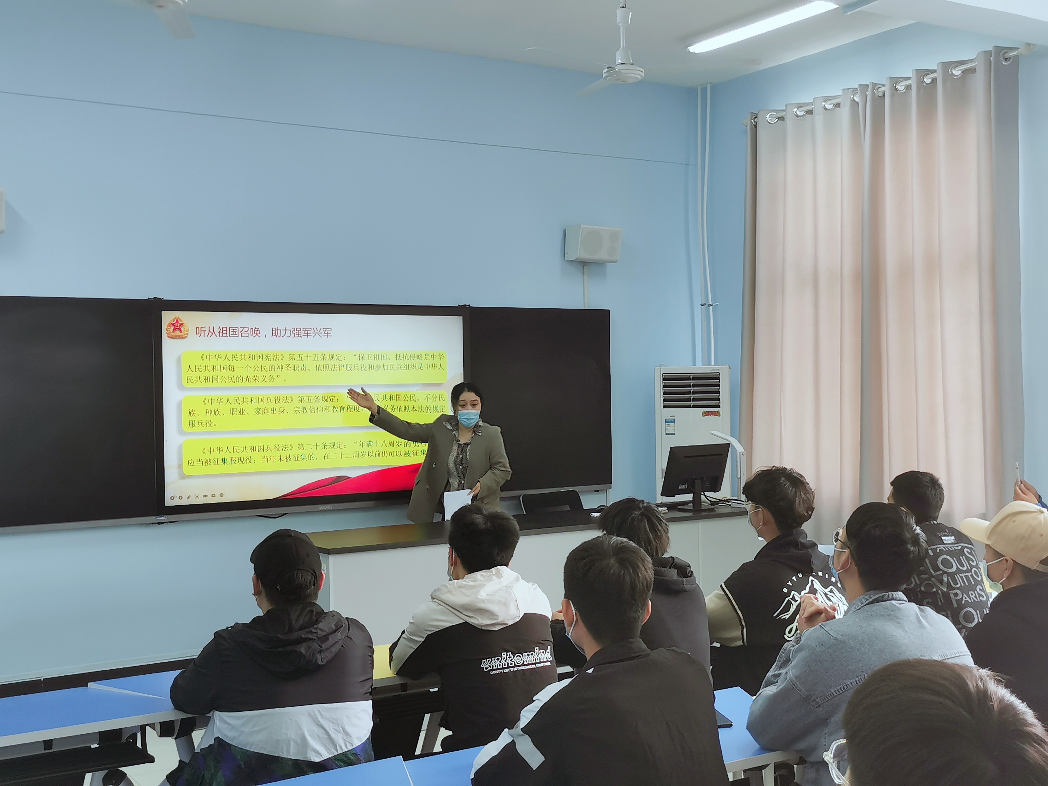 李琦老师从优先征集、部队发展、升学优惠、经济补助、职业发展、政治荣誉、军人优待等七个方面对大学生参军的有利条件进行系统化解读。同学们都听得非常认真,表现出了对参军浓厚的兴趣。