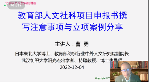 12月4日上午的报告主题为《教育部人文社科项目申报书撰写注意事项与立项案例分享》,主讲专家为曹勇教授。曹勇教授现任教育部纺织行业中外人文研究院常务副院长,武汉纺织大学阳光杰出学者、特聘教授、博导。兼任华中科技大学管理学院教授、博士生导师。担任国家社科基金项目评审专家,国家自科基金项目评审专家,教育部人文社科项目评审专家,教育部高教研修中心长期受聘的国家级科研项目申报与高水平论文撰写辅导专家。